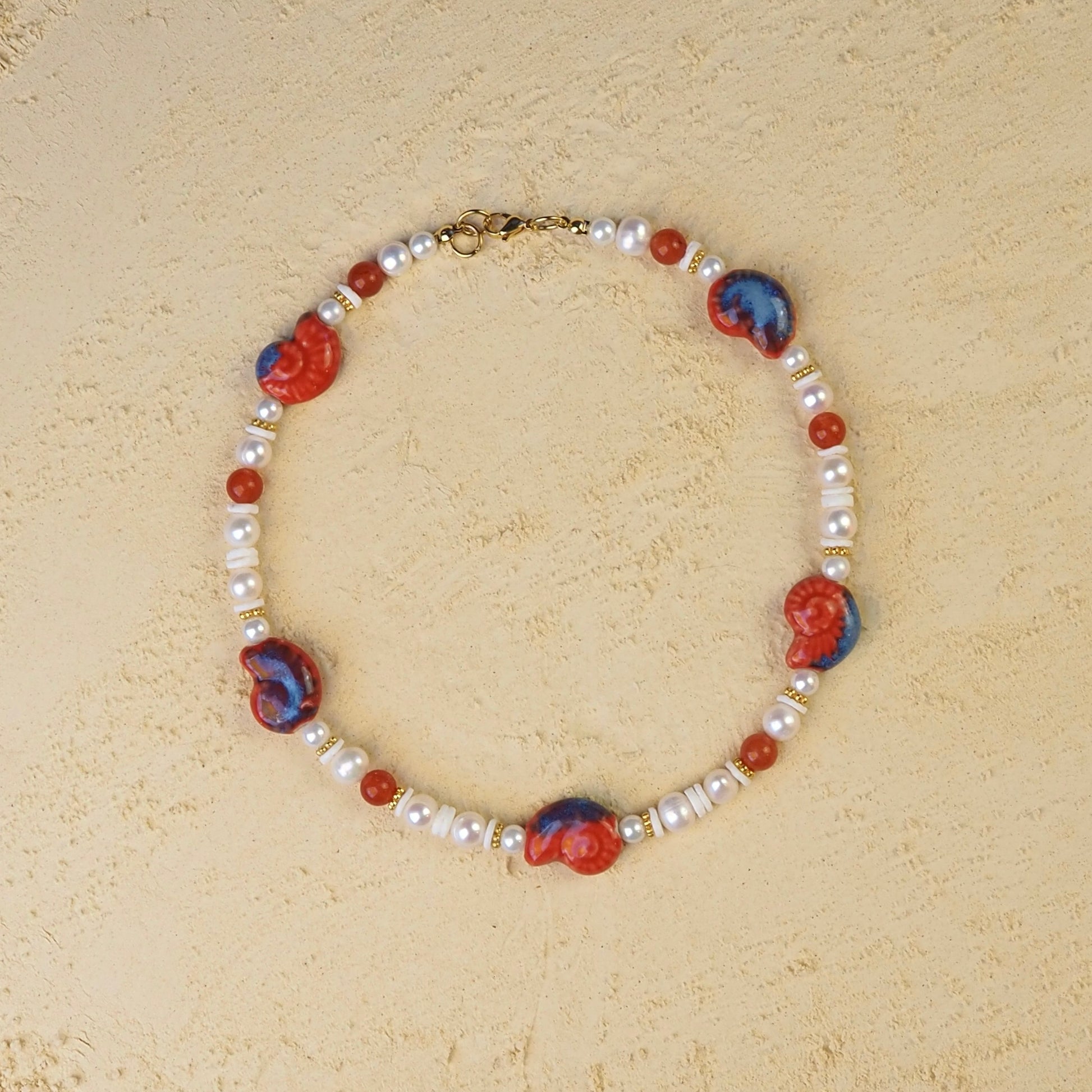 El collar La Perla celebra la elegancia del contraste entre la intensidad del rojo y la serenidad del blanco. Combina cornalina en tonos cálidos con perlas cultivadas de brillo natural. Las piezas en forma de caracol, realizadas en cerámica esmaltada roja y azul, y acabados en acero dorado.