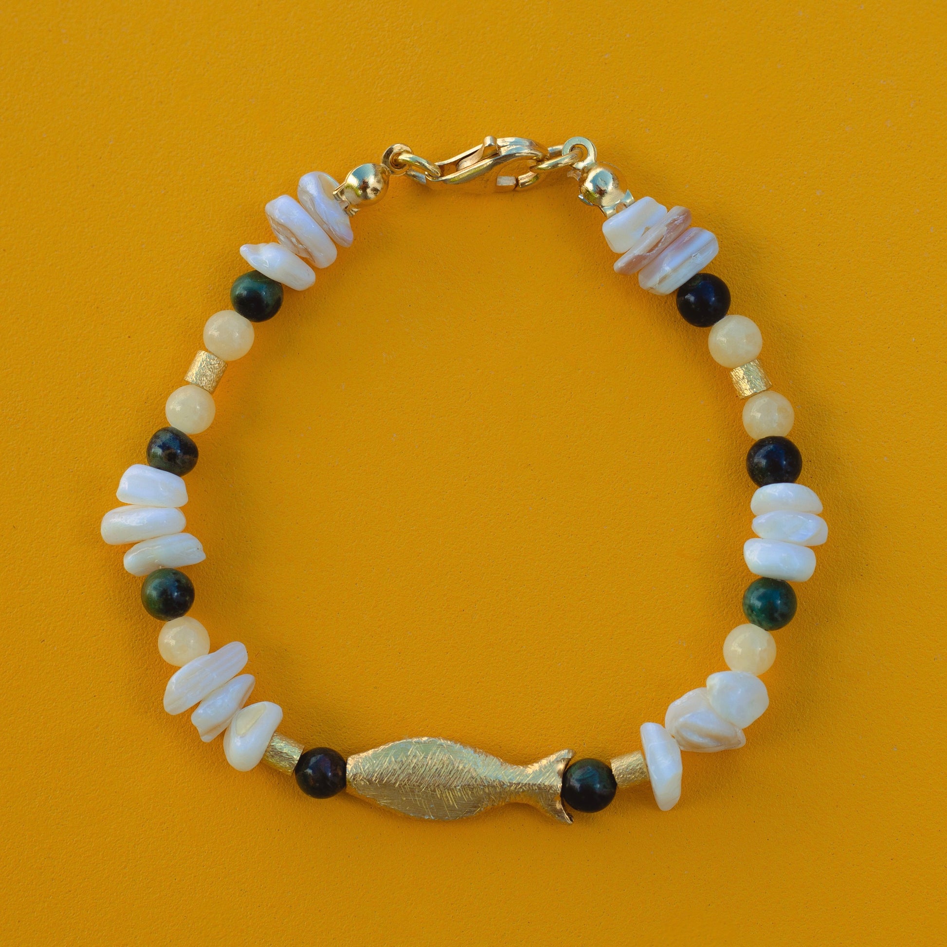 Pulsera hecha a mano con nácar, calcita, ágata, detalles de plata bañado en oro y acabados de acero.