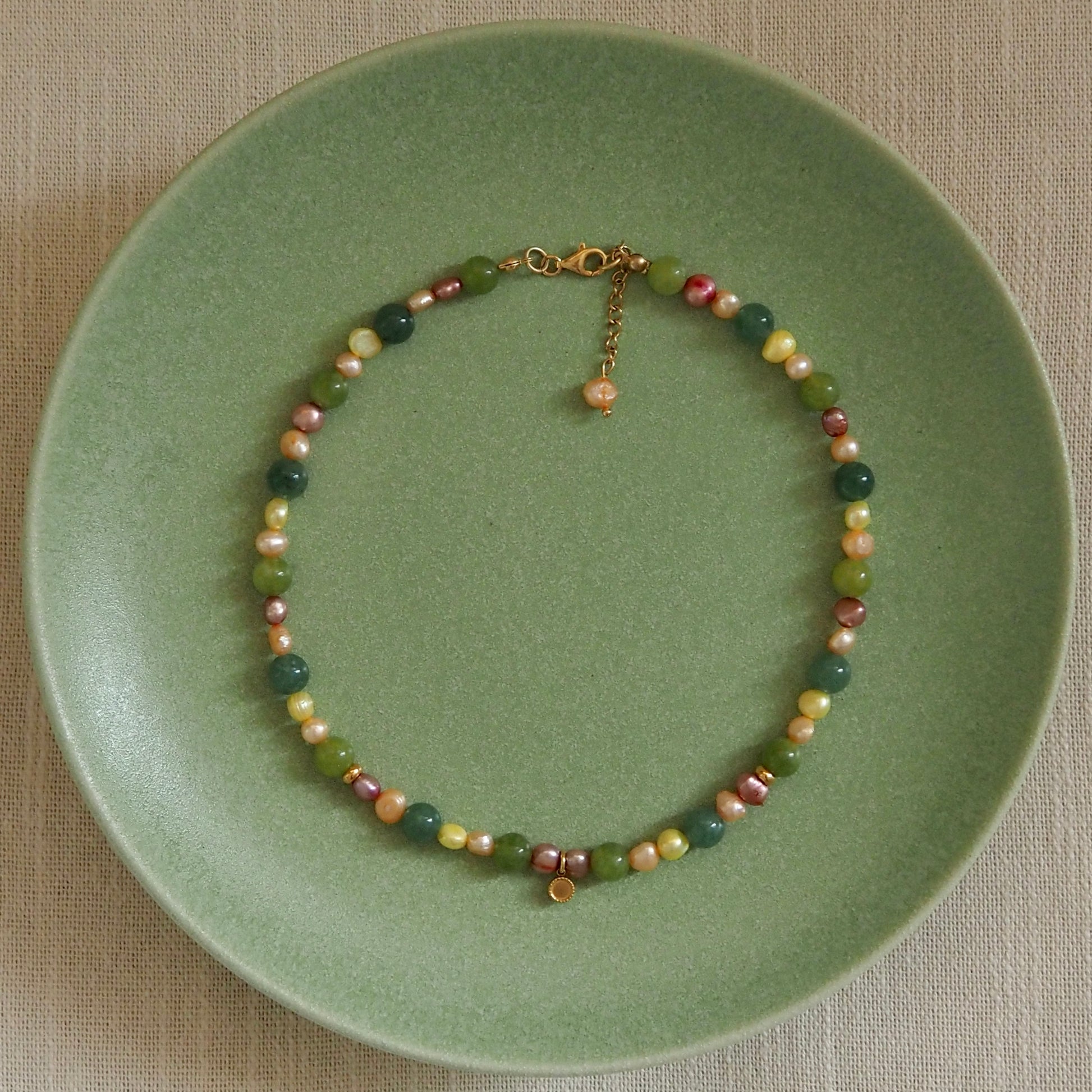 Collar hecho a mano con perlas de río de diferentes colores, Jade, Aventurina y colgante/acabados de acero dorado.