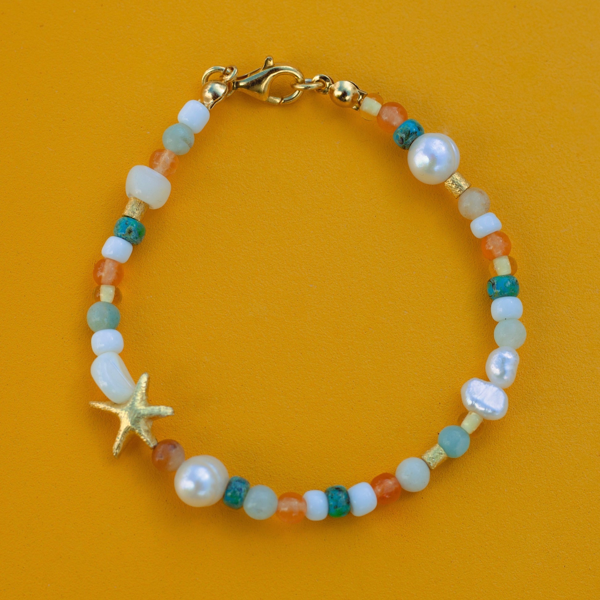 Pulsera hecha a mano con perlas de río, ágata, cuarzo, nácar, detalles en plata bañada en oro y acabados de acero.