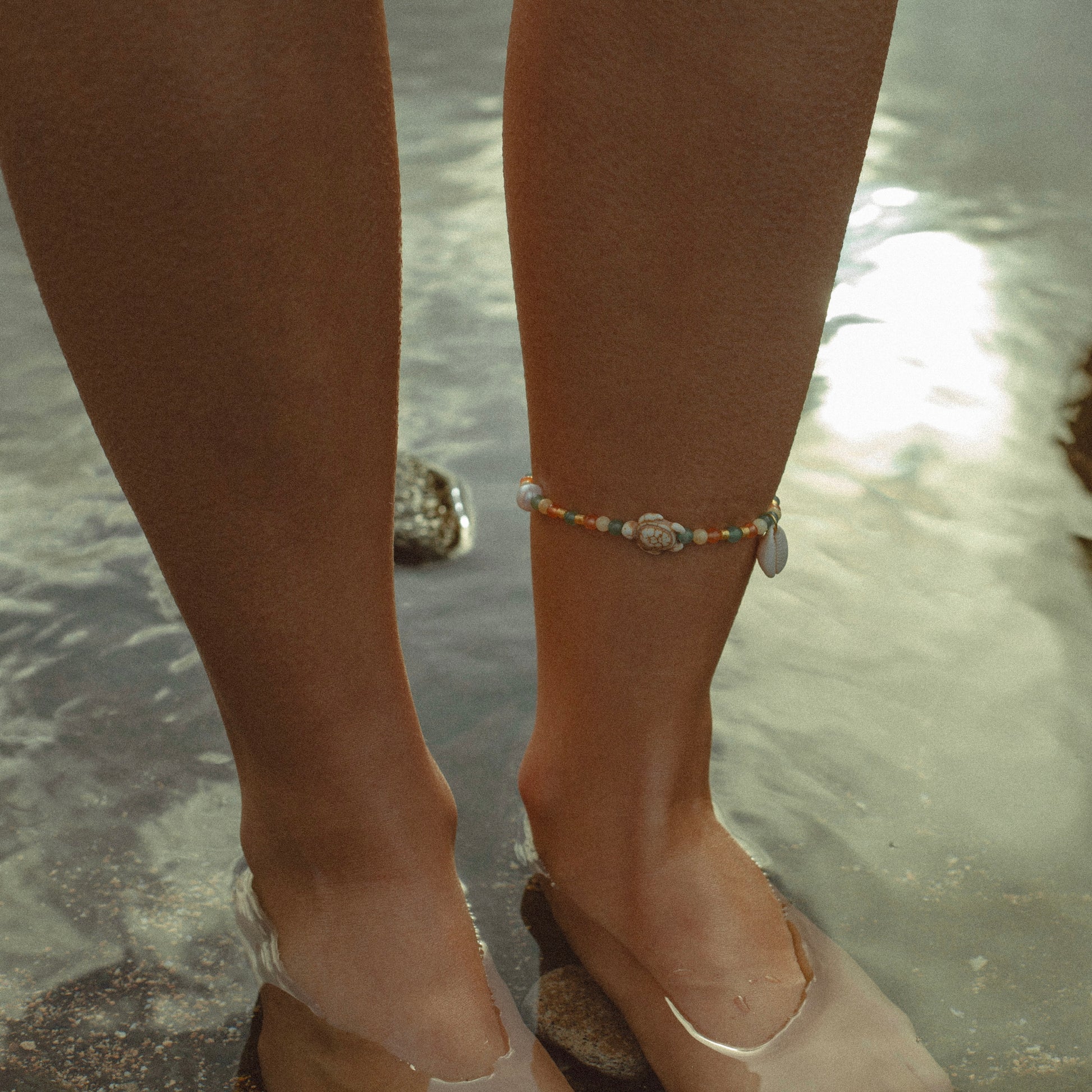 Tobillera hecha a mano con calcita, cuarzo, prehnita, turquesa blanca, detalles de plata bañada en oro y acabados de acero dorado.